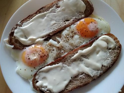 Um den Trübsal zu unterbrechen, mein heutiges Frühstück bzw. Brunch: zwo Spiegeleier, diesmal nicht in einem Nest aus Brot, sondern zwischen zwei Scheiben. Der Brotbelag ist Schmelzkäse (musste sowieso weg).