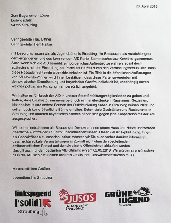 Man muss es sich auf der Zunge zergehen lassen: sie entblöden sich nicht, im Falle der Nichtbefolgung mit Randale zu drohen. Das qualifiziert das Schreiben zum Offenen Drohbrief. – Angesichts der Drohung hat der Wirt abgesagt: verständlich, sein Geschäft ist Ausschank, nicht Straßenkampf.