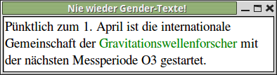 Also mir persönlich macht gegenderte Sprache Pickel. Beim Wortungetüm Gravitationswellenforscher*innen riss mein Geduldsfaden, und ich erstellte ein Script dagegegen in Tcl/Tk.