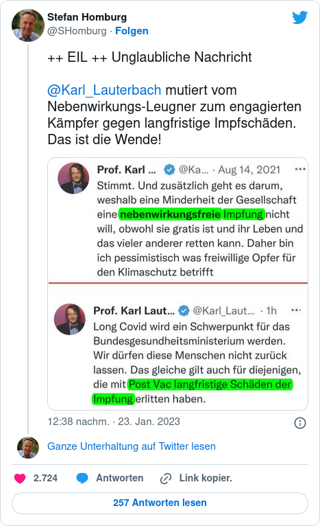 Wieʼs ausschaut hat Karl Lauterbach, Meister der Panik, umgesattelt: vom Impfschaden anrichten auf Impfschaden abhelfen.
