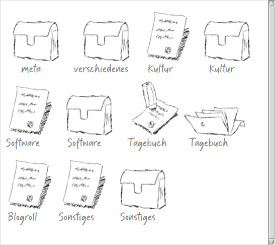 Andersrum erklärt – die Ordnersymbole „Sonstiges“, „Tagebuch“, „Software“ und „Kultur“ haben als links davor angeordnetes Symbol ein „Führungsdokument“.