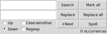 Schaltfläche Spell im Suchfenster führt Rechtschreibkontrolle durch. Unbekannte Worte erscheinen im Dokumentfenster rot unterstrichen.